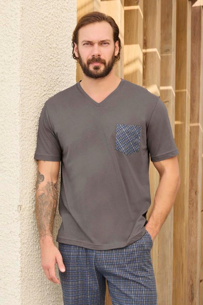 Aydoğan Erkek V Yaka Kısa Kollu Pijama Takımı - Antrasit Gri Üst & Ekose Desenli Alt, %100 Pamuk