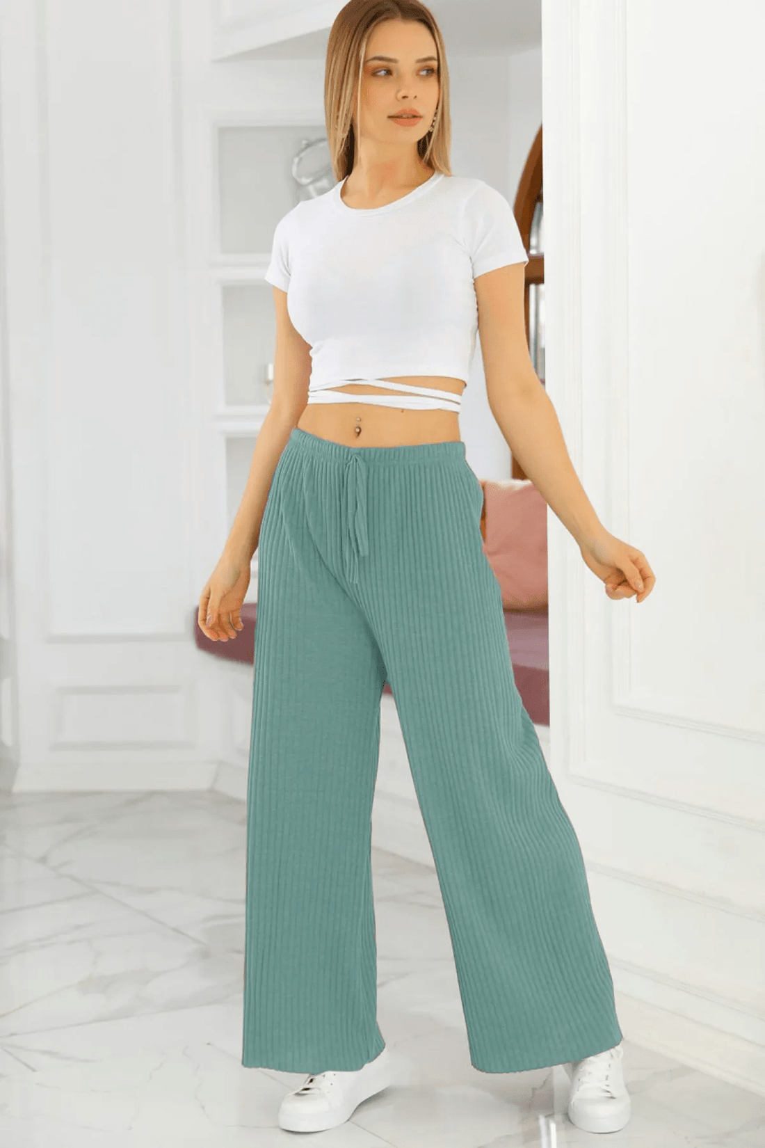 Kadın Fitilli İnce Kumaş Günlük Giyim Rahat Kalıp Mint Yeşili Kaşkorse Alt