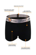 Harry Jons Arizona Premium Kutulu 3 Adet Erkek Boxer Hediyelik Kutu, %95 pamuk ve %5 elastan malzemeden üretilmiştir. 3 boxerın tamamı siyah renklidir ve S, M, L, XL ve XXL olmak üzere beş farklı beden seçeneği bulunmaktadır.