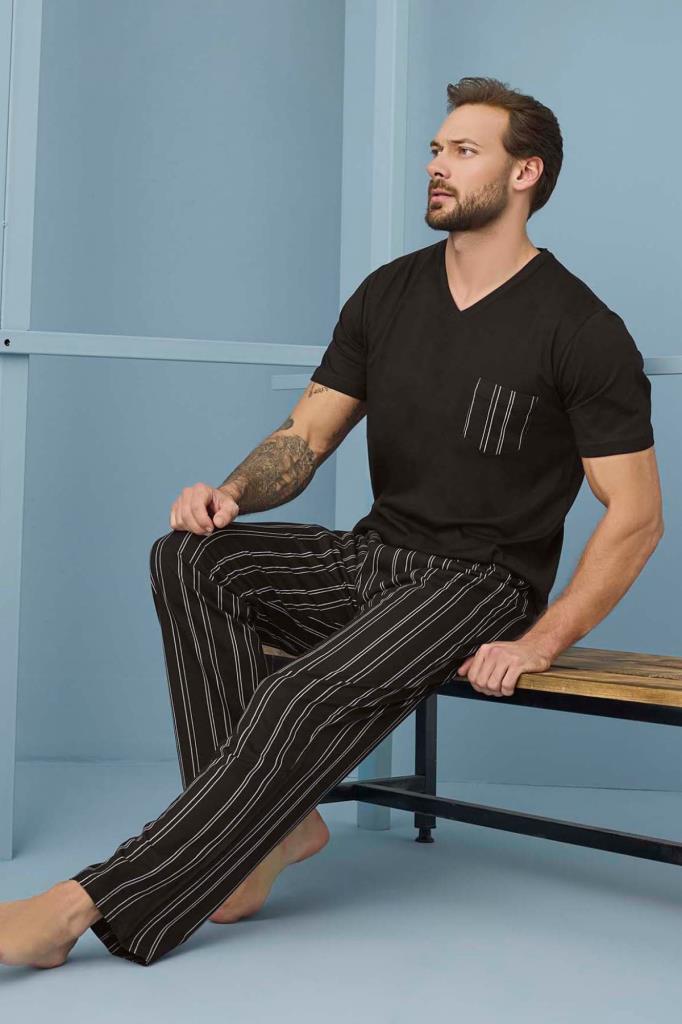 Aydoğan Erkek V Yaka Cepli Pijama Takımı - %100 Pamuk, Siyah Üst & Çizgili Alt