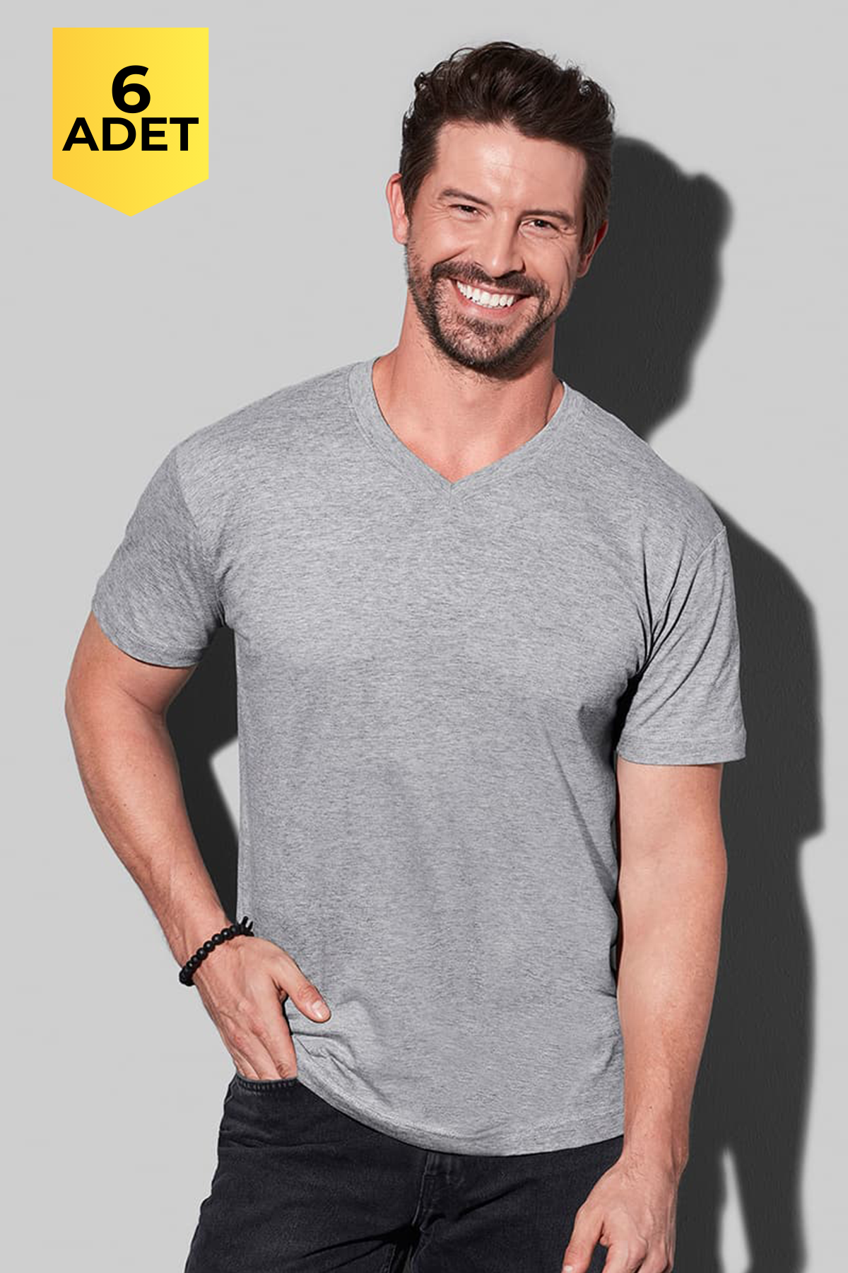 Erkek 6'lı Basic V Yaka Gri Penye Tişört - Özel Premium Kutusunda