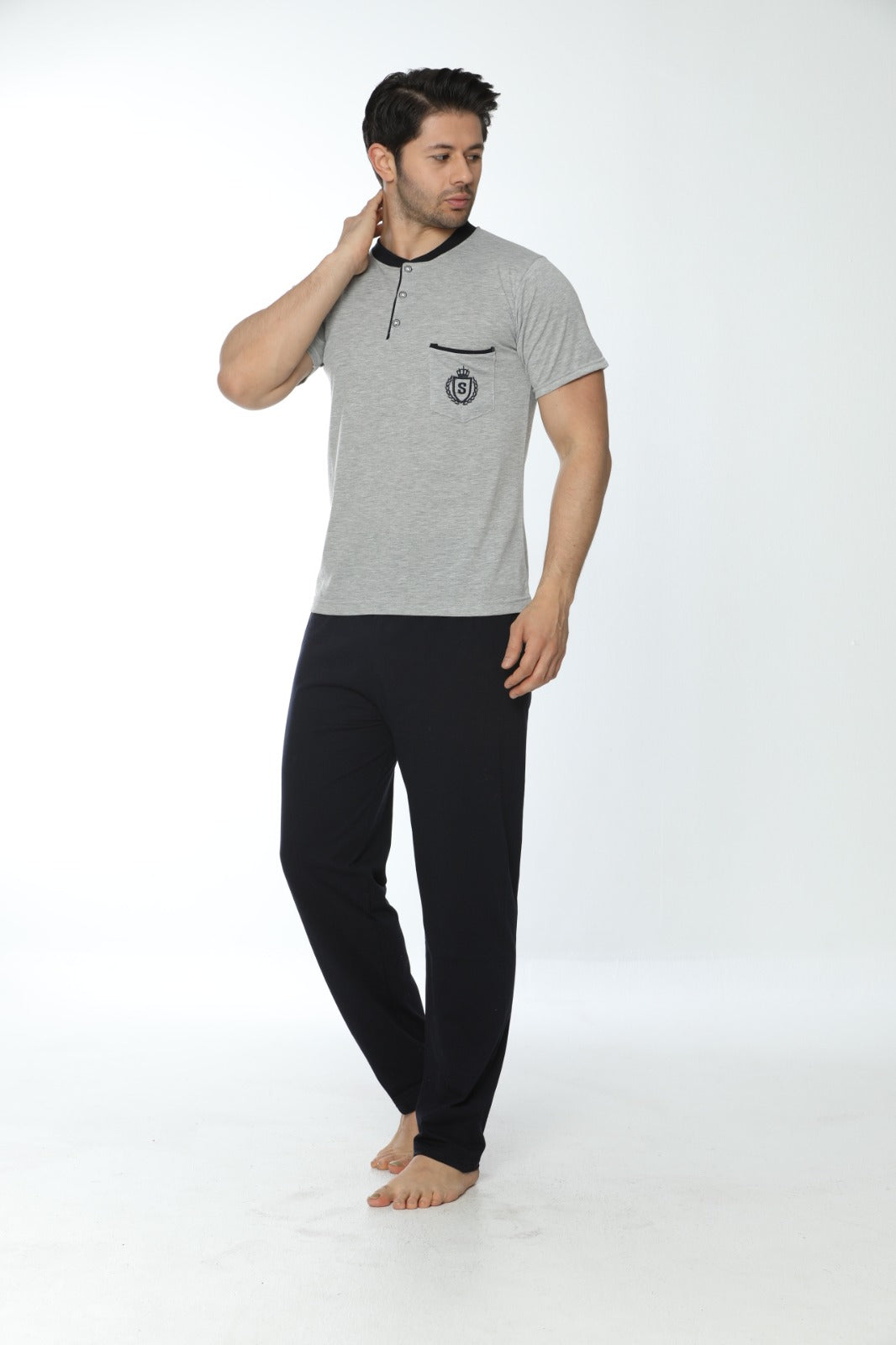 Erkek Ön Cepli Düğmeli Yaka 100% Pamuk Kısa Kollu Gri Pijama Takımı