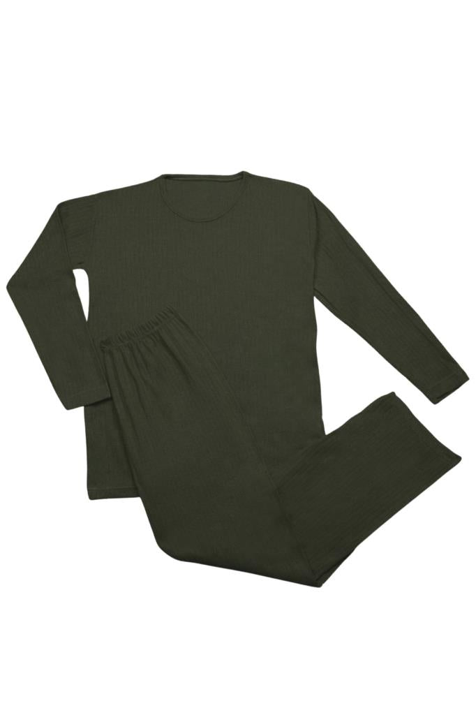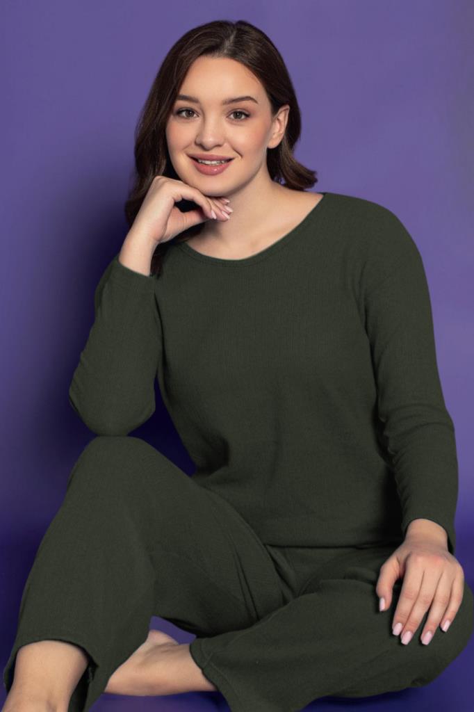 İkili Kadın Rahat Pijama Takımı – Fitilli, İç Göstermez, Koyu Haki