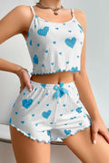 Kadın Beyaz Mavi Kalp Desenli Askılı Şortlu Pijama Takım