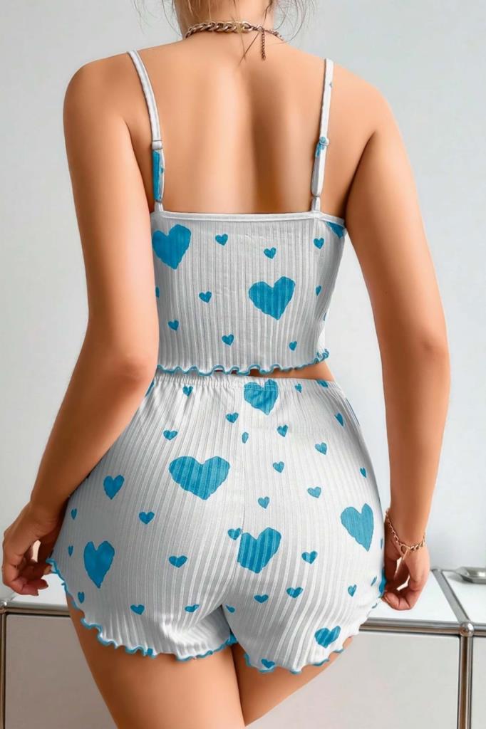 Kadın Beyaz Mavi Kalp Desenli Askılı Şortlu Pijama Takım, tatlı desenleri ve rahat kesimi ile size mükemmel bir uyku deneyimi sunar. Konforu ve şıklığı birleştiren bu takım, her anınızda rahatlık ve tarzınızı vurgular!