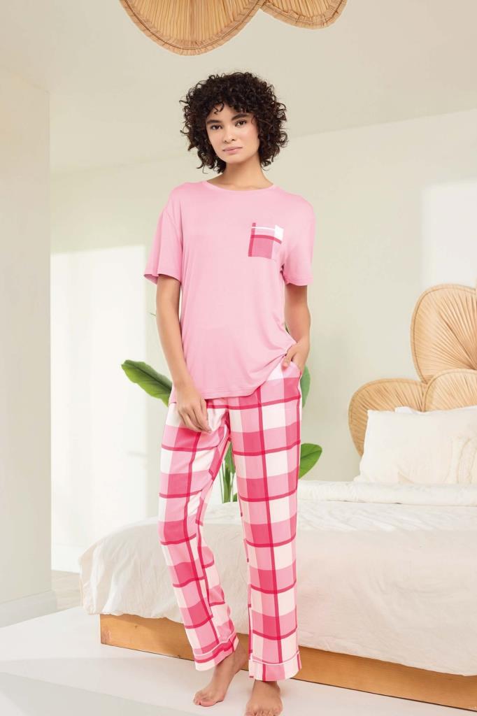 Kadın Pembe Viskon Kumaş İkili Pijama Takımı