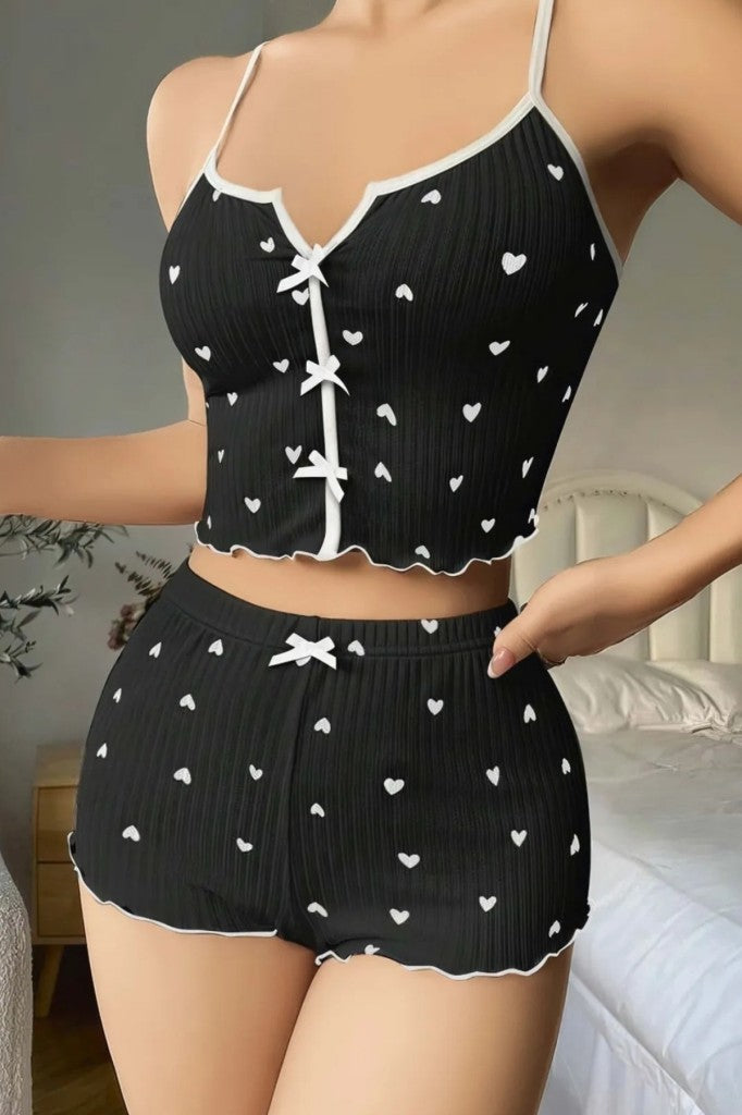 Kadın Pijama Takımı Şortlu Gecelik Sabahlık Siyah Kalp Detaylı Takım