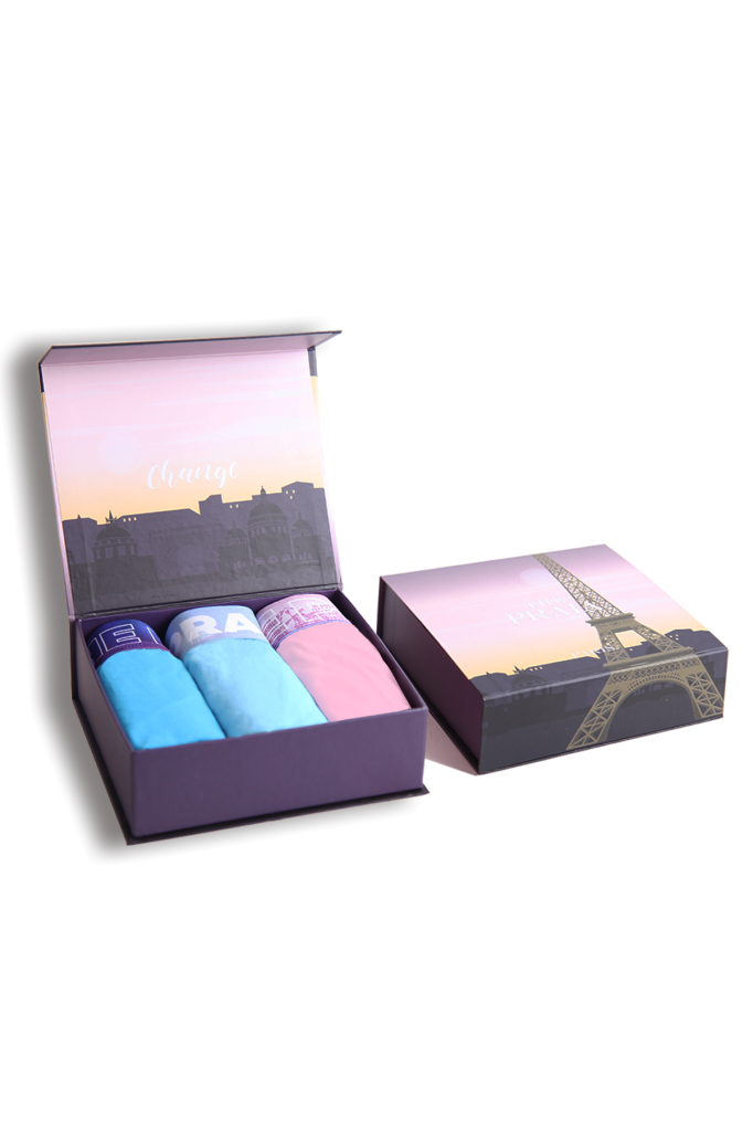 Bu özel kutulu set, lacivert,mavi ve pembe renkleri ile özel tasarım boxerlarla birlikte sunulmaktadır. "Paris" desenli boxerlar, markanın özel tasarımı ve yüksek kalitesiyle öne çıkmaktadır. Ayrıca, hediyelik olarak tasarlanan bu ürün, şık bir kutuda sunulmaktadır.