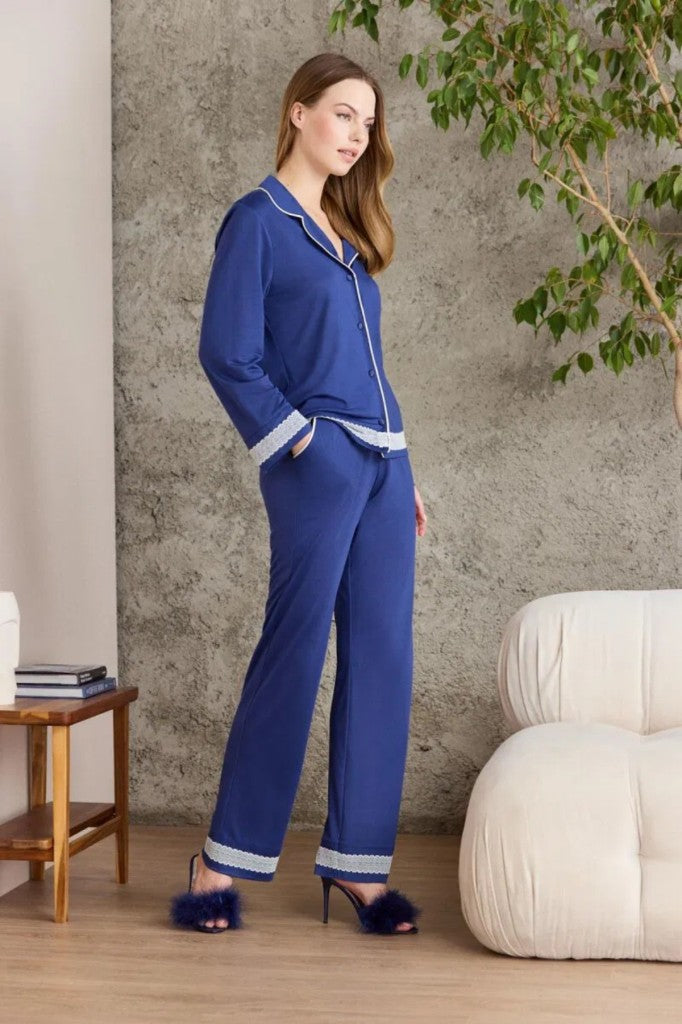 Yumuşacık penye kumaşı ve zarif dantel detaylarıyla ön plana çıkan bu kadın pijama takımı, ev giyiminde hem şıklığı hem de rahatlığı bir araya getiriyor. Göğüs, omuz ya da paça bölgesindeki dantel süslemeler; klasik pijama formuna modern ve feminen bir dokunuş katarken, biyeli tasarımıyla da estetik bir bütünlük sağlar.