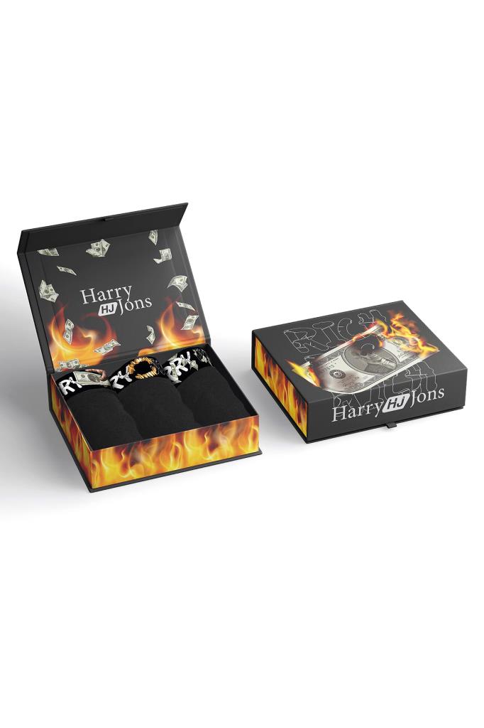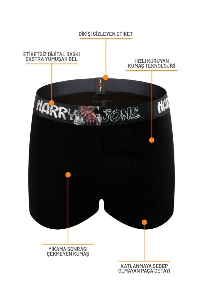 Harry Jons Rich Premium Kutulu 3 Adet Erkek Boxer Hediyelik Kutu, %95 pamuk ve %5 elastan malzemeden üretilmiştir. 3 boxerın tamamı siyah renklidir ve S, M, L, XL ve XXL olmak üzere beş farklı beden seçeneği bulunmaktadır.