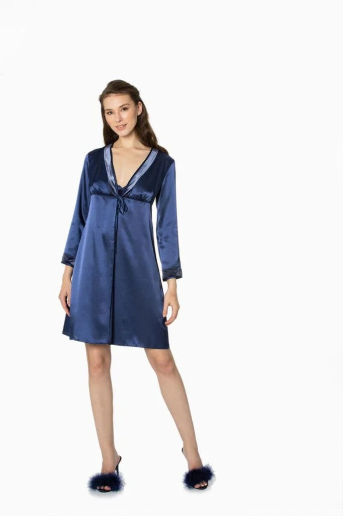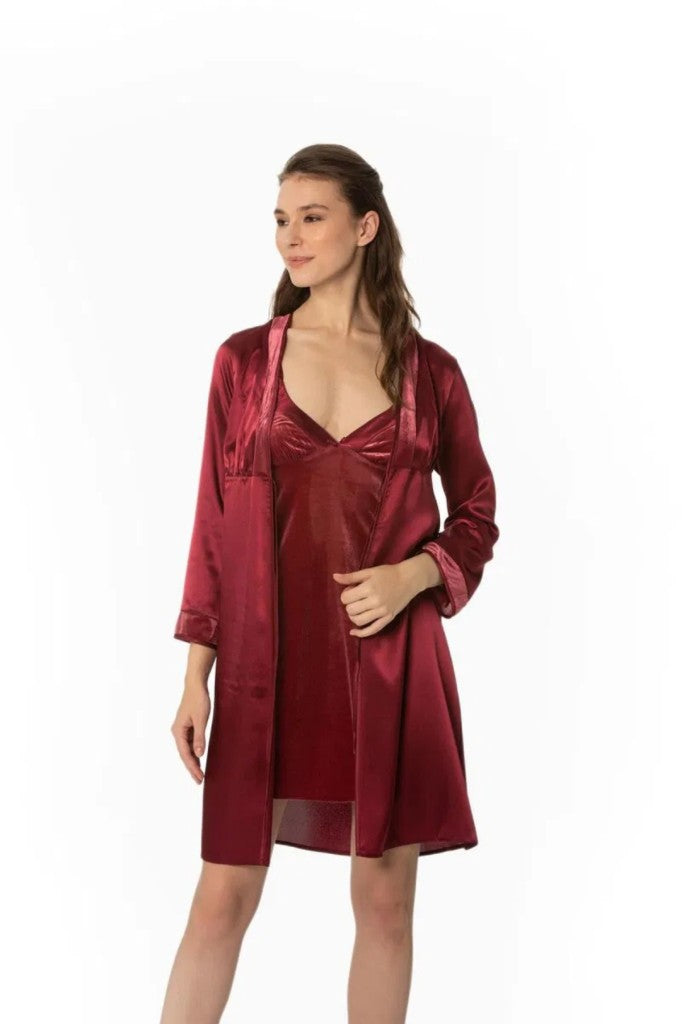 Kuşaklı sabahlık, rahat ve şık bir görünüm sağlarken ince askılı gecelik vücuda nazikçe oturur. Özel günlerde, balayı tatillerinde veya evde kendinizi şımartmak istediğiniz anlarda ideal bir tercihtir.