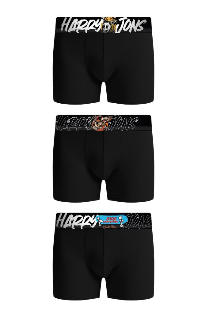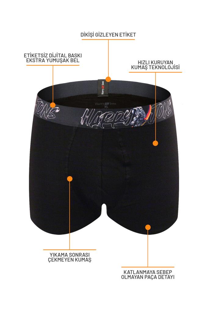 Harry Jons Skate Premium Kutulu 3 Adet Erkek Boxer Hediyelik Kutu, %95 pamuk ve %5 elastan malzemeden üretilmiştir. 3 boxerın tamamı siyah renklidir ve S, M, L, XL ve XXL olmak üzere beş farklı beden seçeneği bulunmaktadır.