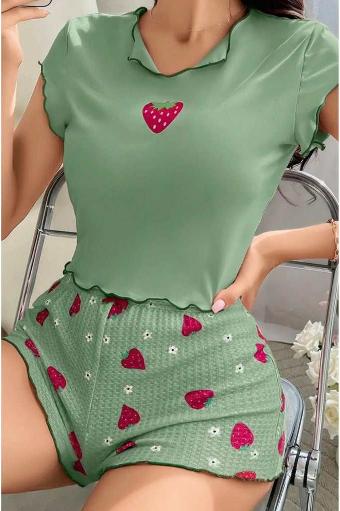 Canlı su yeşili rengiyle tazelik hissi uyandıran bu çilek desenli ikili takım, hem rahatlığı hem de şirin tarzıyla göz dolduruyor. Hafif ve nefes alan kumaşı sayesinde cildinizle uyum içinde hareket eder, yaz aylarında bile ferah bir kullanım sunar.